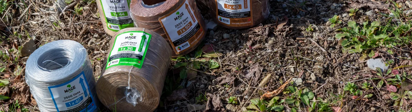 Nos bobines de liens photodégradables sont composées d’une âme acier, recouverte d’un revêtement plastique photodégradable.