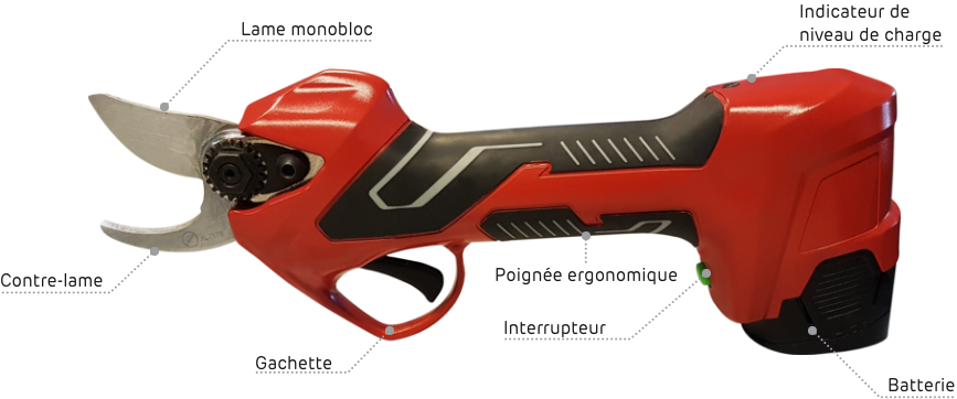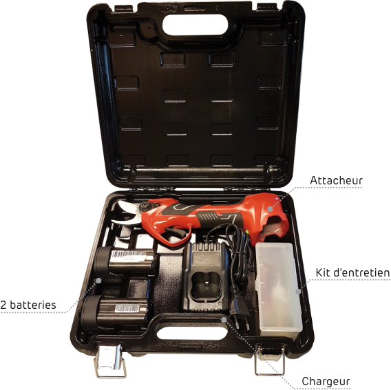 Avec une autonomie de 4 à 6 heures de travail, il est livré avec deux batteries et une valise de rangement qui permet de ranger tous les éléments : sécateur, batteries, chargeur et kit d’entretien.